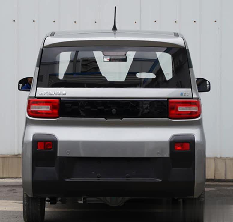 这辆五菱宏光MINI EV的外观造型非常简洁,前脸方正硬朗,采用了宽阔厚重的车头,配合较多的直线条,看起来比较硬朗、简洁大方。前杠两侧雾灯区域使用了一块竖立式黑色装饰护板,增加了跨界气质。侧面是简单的双门结构,为了营造时尚感,高撇版本会提供双色车身涂装。