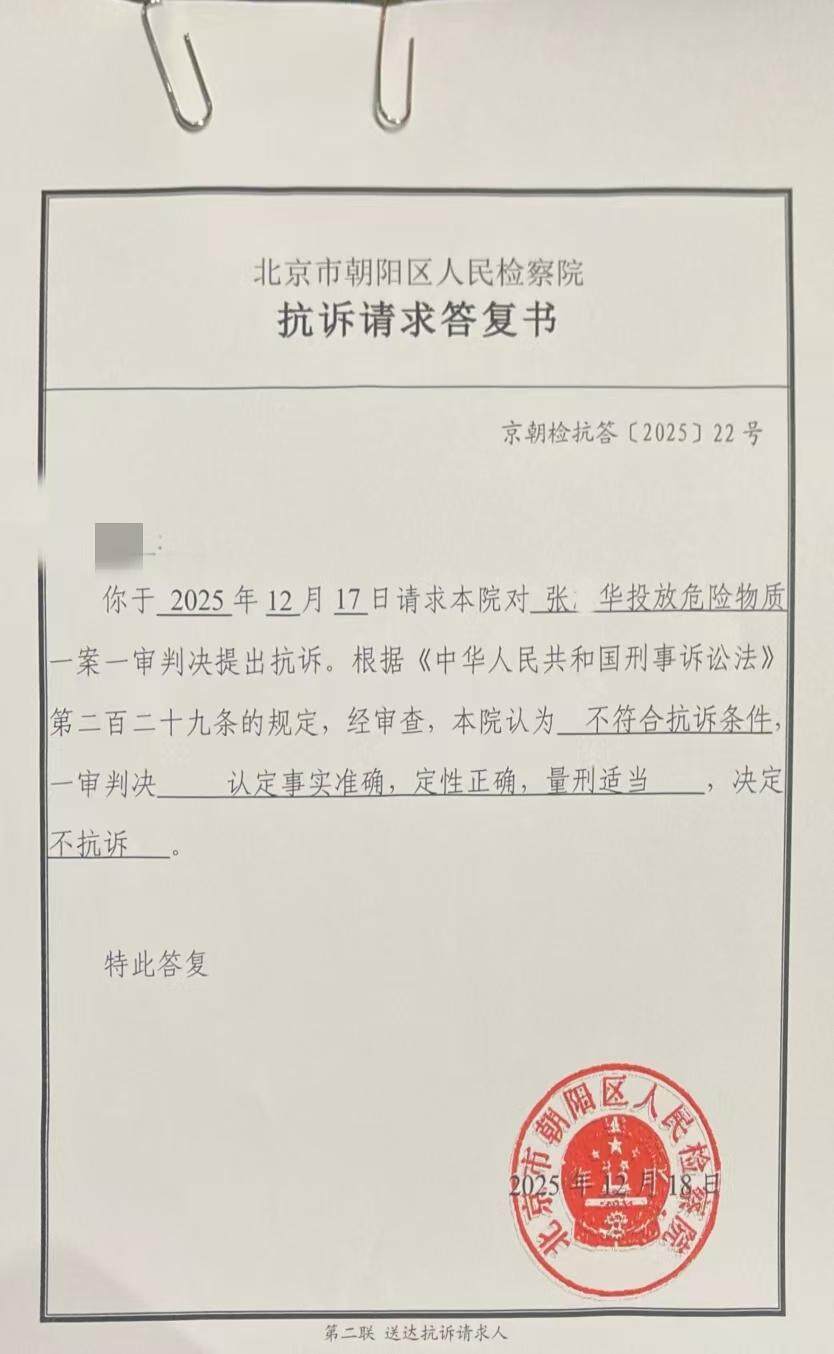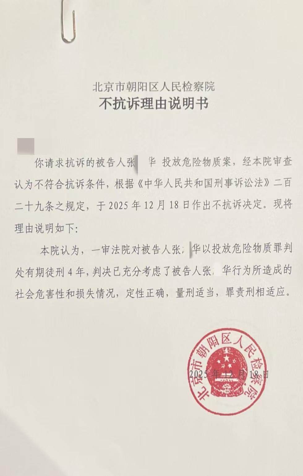 北京市朝阳区人民检察院出具的《不抗诉理由说明书》中显示,“本院认为金勺子,一审法院对被告人张某华以投放危险物质罪处有期徒刑4年……定性正确,量刑适当,罪责刑相适应。”